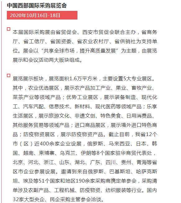 中國西部國際采購展覽會(以下簡稱“國際采購展”),于2020年10月16日-18日在西安國際會展中心展覽館1號展廳舉行。本屆國際采購展以“共享全球市場,提升高質(zhì)量發(fā)展”為主題,深度融入共建“一帶一路”,助力陜西打造內(nèi)陸改革開放高地,落實(shí)好穩(wěn)外資、穩(wěn)外貿(mào)的要求,更好服務(wù)疫情常態(tài)化形勢下企業(yè)開拓國際市場。我公司受西安貿(mào)促會邀請參加本次展覽會。